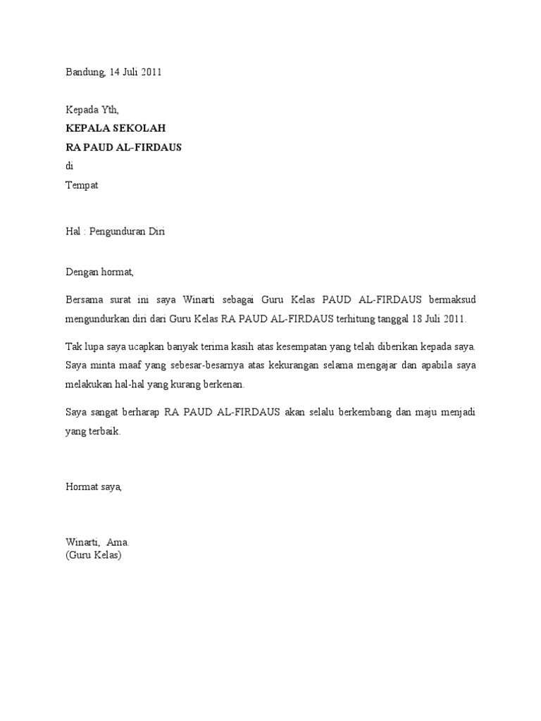 Contoh Surat Pengunduran Diri Guru Tk Bagi Contoh Surat